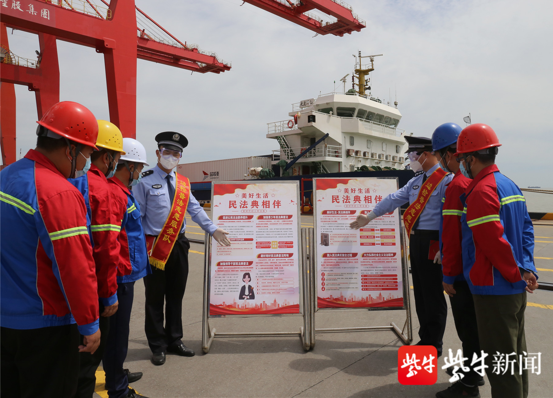 邊檢民警與碼頭工人一起現(xiàn)場學習《民法典》