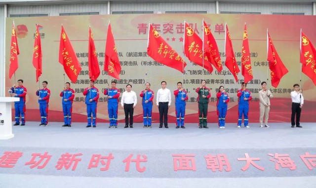 活動中,與會領導為12個圍繞服務重大項目而組成的青年集體突擊隊進行授旗,青年突擊隊、青年文明號代表作表態發言,并舉行了“強國復興有我 青春燃在海港”鹽城港青年宣誓儀式。