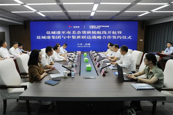 9月17日,鹽城港至南美雜貨班輪航線開航暨鹽城港集團與中集世聯達戰略合作簽約儀式成功舉行。集團黨委書記、董事長、總經理周正雄主持活動。中集世聯達長江物流副總經理劉羽,鹽城海關二級高級主辦李健,鹽城海關駐大豐港海關辦事處主任崔克勁,集團總經理助理孫永峰等參加并鑒簽。鹽城港港口公司董事長袁欣代表集團與中集世聯達長江物流公司簽訂合作協議。