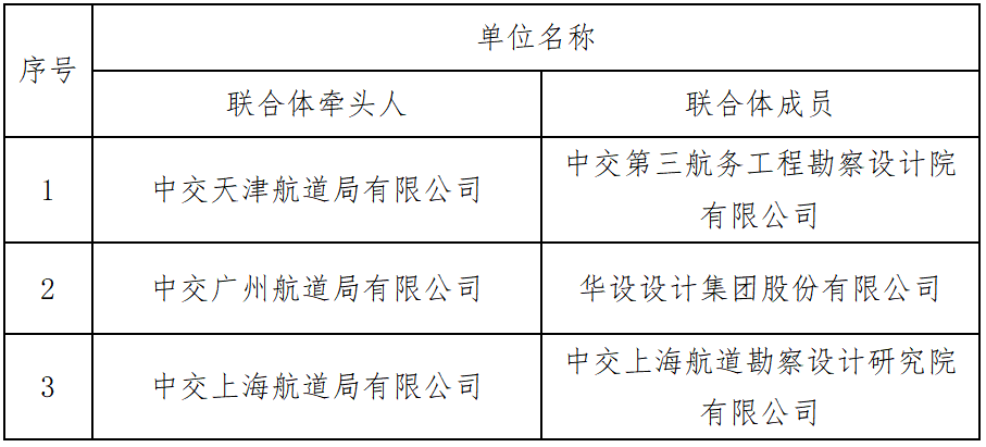 根據《濱海港區挖入式港池清理改造工程設計施工總承包BHGC-EPC標段招標文件》評標辦法,經評標委員會評審,以下單位入圍定標候選人: