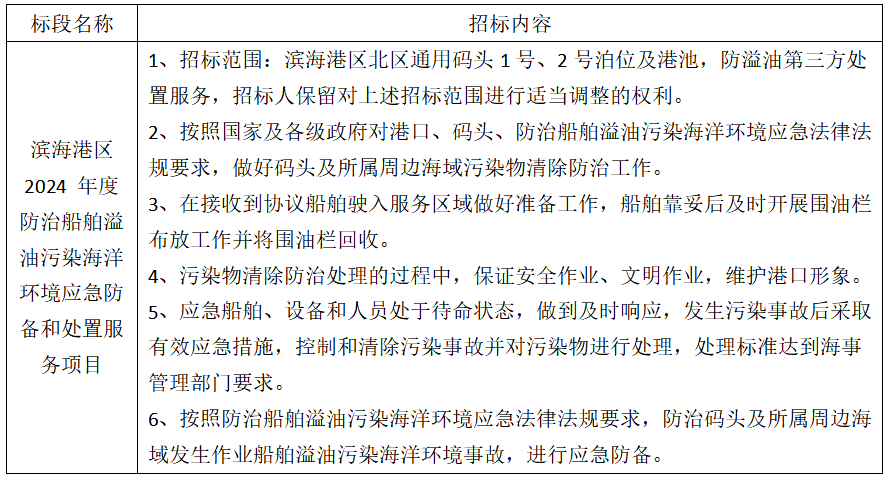 1、項目名稱:濱海港區 2024 年度防治船舶溢油污染海洋環境應急防備和處置服務項目