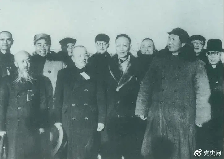 1949年3月,各界人士代表在北京西苑機場同毛澤東、朱德等留影。