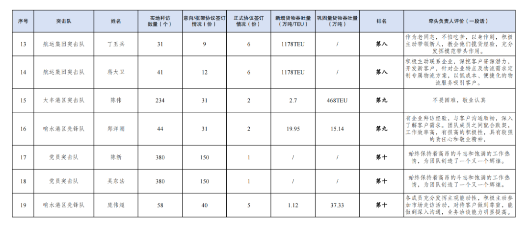 第一名:巾幗突擊隊(duì) 李婷婷(拜訪客戶312家,簽訂意向協(xié)議56份,簽訂正式協(xié)議5份,新增貨物吞吐量88TEU,鞏固量貨物吞吐量202TEU);黨員突擊隊(duì) 朱燕(拜訪客戶180家,簽訂意向協(xié)議140份,簽訂正式協(xié)議7份,新增貨物吞吐量10萬噸,鞏固量貨物吞吐量51.69萬噸)