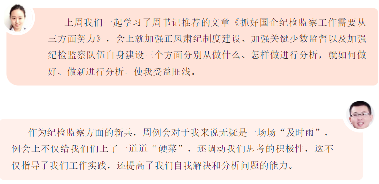 紀(jì)檢監(jiān)察業(yè)務(wù)周例會是大豐港區(qū)提高紀(jì)檢條線工作能力的方式,也是建設(shè)學(xué)習(xí)型紀(jì)檢干部的有效嘗試。“學(xué)習(xí)要有干貨,不能搞花架子,要了解我們的干部最需要學(xué)什么,緊貼實際需求和工作要求來安排學(xué)習(xí)內(nèi)容。”大豐港區(qū)紀(jì)檢相關(guān)負(fù)責(zé)人表示,深化監(jiān)察體制改革,對紀(jì)檢監(jiān)察干部的業(yè)務(wù)能力提出了更高更嚴(yán)的要求,學(xué)習(xí)就是要著力補(bǔ)短板、強(qiáng)弱項,解決紀(jì)檢監(jiān)察干部本領(lǐng)“恐慌”問題。例會上,就集團(tuán)紀(jì)委下發(fā)文件精神進(jìn)行剖析、對日常監(jiān)督如何抓、信息宣傳選題立意、特色亮點提煉歸納進(jìn)行培訓(xùn)。會上還提倡“我的問題大家答”,組織交流討論、現(xiàn)場解答,鼓勵善于發(fā)現(xiàn)問題,積極解決問題,創(chuàng)新理念思路,確保可以“充電補(bǔ)能”,提升業(yè)務(wù)能力。