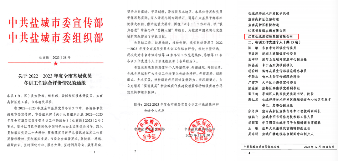 近日,中共鹽城市委宣傳部、中共鹽城市委組織部聯合發文《關于2022—2023 年度全市基層黨員冬訓工作綜合評價情況的通報》,鹽城港集團獲評2022—2023 年度全市基層黨員冬訓工作先進集體。
