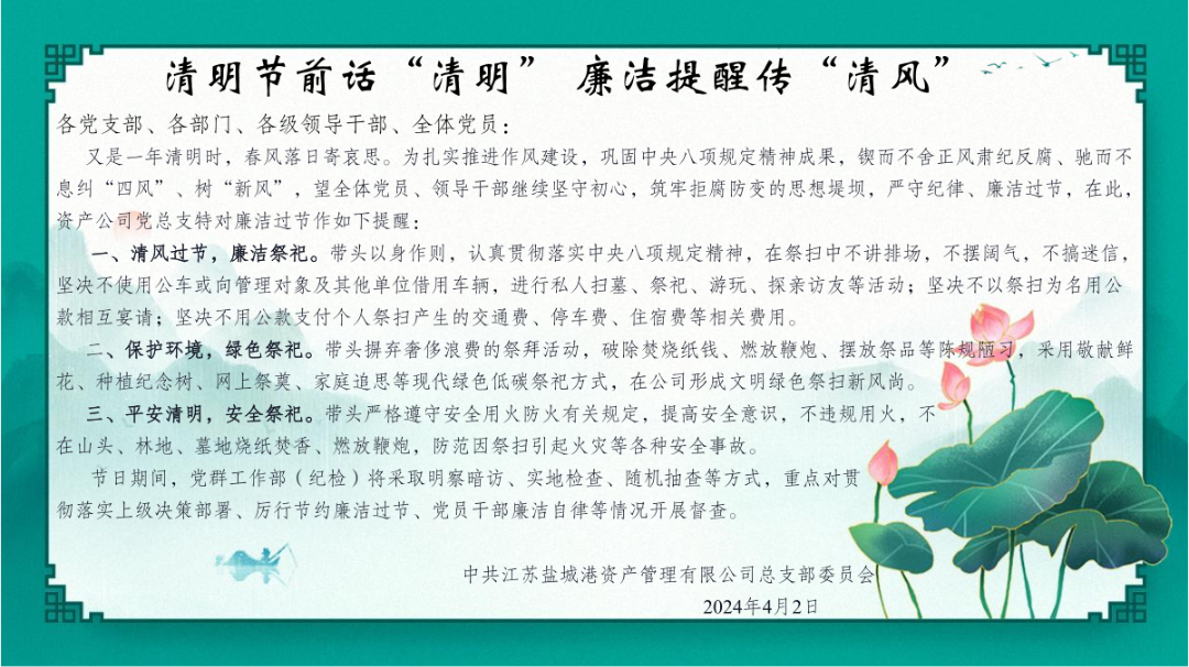 下一步,資產公司將持續緊盯關鍵時刻、關鍵崗位及重大節日,持續加強對黨員干部的全方位管理和經常性監督,多措并舉營造從嚴氛圍,常態化開展好廉政警示教育活動,扎實推進“清廉資產”建設,夯實平安建設根基,為集團“五新示范港”建設貢獻力量。
