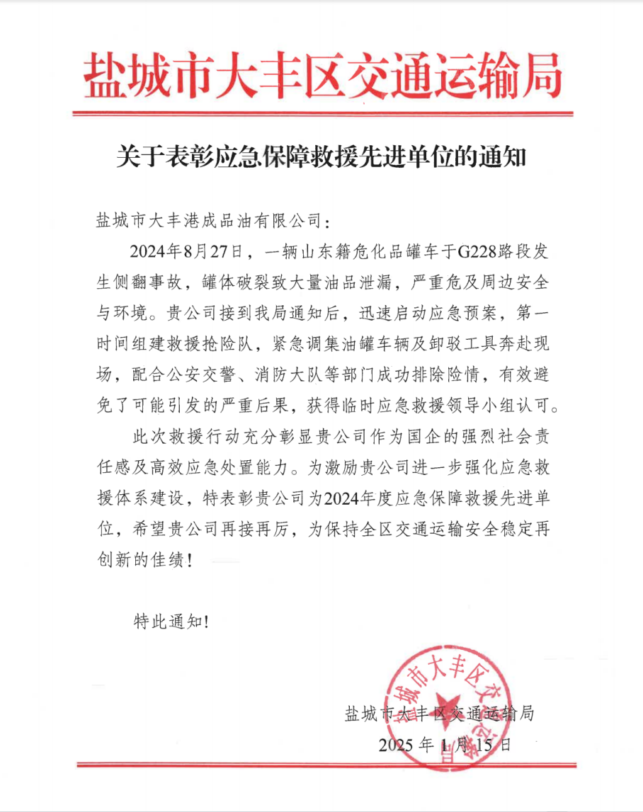 近日,鹽城市大豐區(qū)交通運(yùn)輸局將一份“2024年度應(yīng)急保障救援先進(jìn)單位”榮譽(yù)證書頒發(fā)給成品油公司,以表彰該公司在2024年8月的一次應(yīng)急救援行動(dòng)中,展現(xiàn)的卓越的應(yīng)急響應(yīng)能力和高度的社會(huì)責(zé)任感。