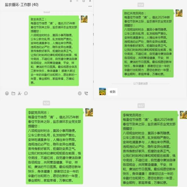 鹽農循環農業堅持早研究、早部署、早警示,以節前“廉”動為抓手,持續營造風清氣正的節日氛圍,節前發送廉潔提醒短信,將警示提醒融入溫馨祝福之中引導全體黨員干部、群眾把好“廉潔關”繃緊“廉潔弦”。