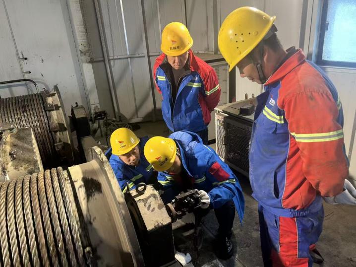 本次設(shè)施維保由機(jī)修組、門機(jī)組牽頭組織,港區(qū)在崗一線人員全員參與。在高聳的門機(jī)象鼻梁處,技術(shù)人員不懼登高、精細(xì)作業(yè),針對(duì)長期受粉塵侵蝕、設(shè)備振動(dòng)影響的監(jiān)控?cái)z像頭,逐一開展檢修調(diào)試,徹底解決信號(hào)不穩(wěn)、視野模糊問題,確保門機(jī)操作全程無死角、視野清晰可控;門機(jī)平臺(tái)上,號(hào)子聲鏗鏘有力,舊鋼絲繩在規(guī)范操作中平穩(wěn)卸下,嶄新鋼索在眾人合力牽引下精準(zhǔn)落位,每一步都嚴(yán)謹(jǐn)規(guī)范;后方皮帶線沿線,檢修班組分段布控、逐點(diǎn)排查,對(duì)托輥、接頭及防護(hù)裝置進(jìn)行全面緊固更換,不放過任何一處細(xì)微隱患。維保現(xiàn)場,老師傅俯身卷筒旁精準(zhǔn)校準(zhǔn)鋼絲繩張力,青年職工主動(dòng)配合、協(xié)同調(diào)整,新老搭檔默契配合,各道工序環(huán)環(huán)相扣、井然有序,盡顯專業(yè)素養(yǎng)。