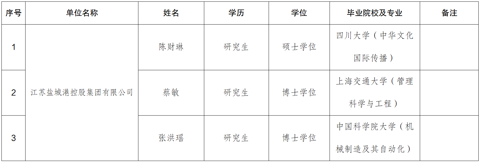 根據(jù)江蘇鹽城港控股集團(tuán)有限公司相關(guān)程序規(guī)定,現(xiàn)對(duì)3名擬錄用人員進(jìn)行公示。