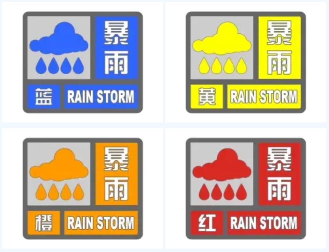 中國氣象上規定,24小時降水量為50毫米或以上的雨稱為“暴雨”。按其降水強度大小又分為三個等級,即24小時降水量為50~99.9毫米稱“暴雨”;100~250毫米之間為“大暴雨”;250毫米以上稱“特大暴雨”。暴雨預警信號的等級分為四個等級,Ⅳ級(一般)、Ⅲ級(較重)、Ⅱ級(嚴重)、Ⅰ級(特別嚴重),分別用藍色、黃色、橙色、紅色中英文圖標標識。