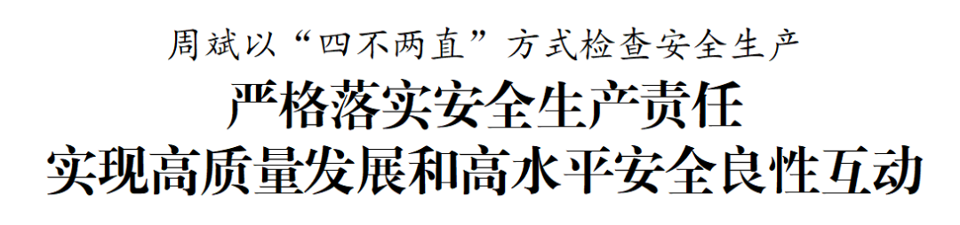 8月5日下午,市委書(shū)記周斌以“四不兩直”方式檢查安全生產(chǎn)工作。他強(qiáng)調(diào),要深入貫徹黨的二十屆三中全會(huì)精神和習(xí)近平總書(shū)記關(guān)于安全生產(chǎn)的重要論述,堅(jiān)持人民至上、生命至上,嚴(yán)格落實(shí)安全生產(chǎn)責(zé)任,扎實(shí)開(kāi)展安全隱患排查整治,全力補(bǔ)齊安全領(lǐng)域短板弱項(xiàng),以“時(shí)時(shí)放心不下”的責(zé)任感和“事事心中有底”的行動(dòng)力,統(tǒng)籌好發(fā)展和安全,努力實(shí)現(xiàn)高質(zhì)量發(fā)展和高水平安全良性互動(dòng)。