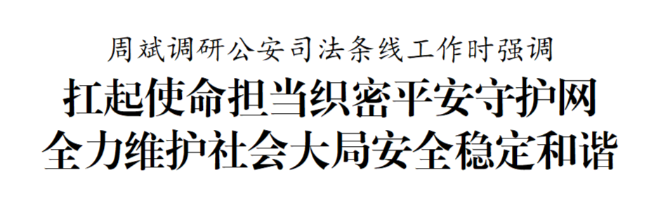 在調(diào)研中,周斌指出,公安司法條線是維護(hù)社會穩(wěn)定的“主力軍”、服務(wù)高質(zhì)量發(fā)展的“護(hù)航員”。要突出政治引領(lǐng),服務(wù)發(fā)展大局,圍繞優(yōu)化營商環(huán)境、護(hù)航產(chǎn)業(yè)發(fā)展、保障民生福祉等中心任務(wù),找準(zhǔn)工作切入點(diǎn)和發(fā)力點(diǎn),為高質(zhì)量發(fā)展提供堅(jiān)強(qiáng)法治保障。要深化社會治理,堅(jiān)持和發(fā)展新時(shí)代“楓橋經(jīng)驗(yàn)”,完善網(wǎng)格化管理、精細(xì)化服務(wù)、信息化支撐的基層治理平臺,提升社會治理現(xiàn)代化水平。要堅(jiān)守人民立場,聚焦群眾“急難愁盼”,扎實(shí)推進(jìn)平安建設(shè)、掃黑除惡、未成年人保護(hù)等工作,不斷增強(qiáng)人民群眾的獲得感、幸福感、安全感。