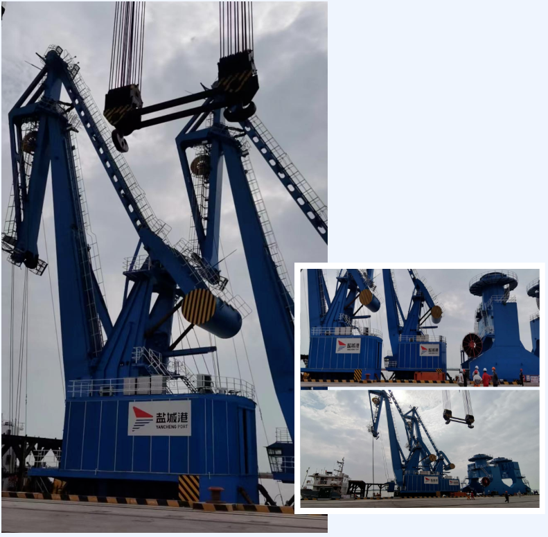 據(jù)悉,本次抵港門機為2臺40-43門座式起重機,由上海振華重工為小蟒牛作業(yè)區(qū)量身定制,具有吊運噸位高、抓取距離遠、故障率低等特點,可搭配抓斗、吊鉤、吸盤等多種吊具,靈活切換作業(yè)模式,操作性能強,作業(yè)效能高。為確保兩臺門機及時安全落戶響水港區(qū),集團設(shè)備技術(shù)部統(tǒng)籌協(xié)調(diào),響水港區(qū)生產(chǎn)經(jīng)營部、投資發(fā)展部積極配合,根據(jù)航道情況及靠泊條件,采用門架和轉(zhuǎn)盤分離的方式運輸,大輪靠泊后先用浮吊將門架部分吊裝上岸落軌后,再將轉(zhuǎn)盤部分吊至門架上筒體處通過高強度螺栓連接的方式完成整機的總裝。后續(xù)這兩臺門機將進入調(diào)試階段,投產(chǎn)指日可待。